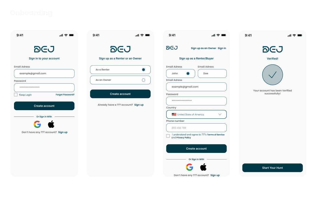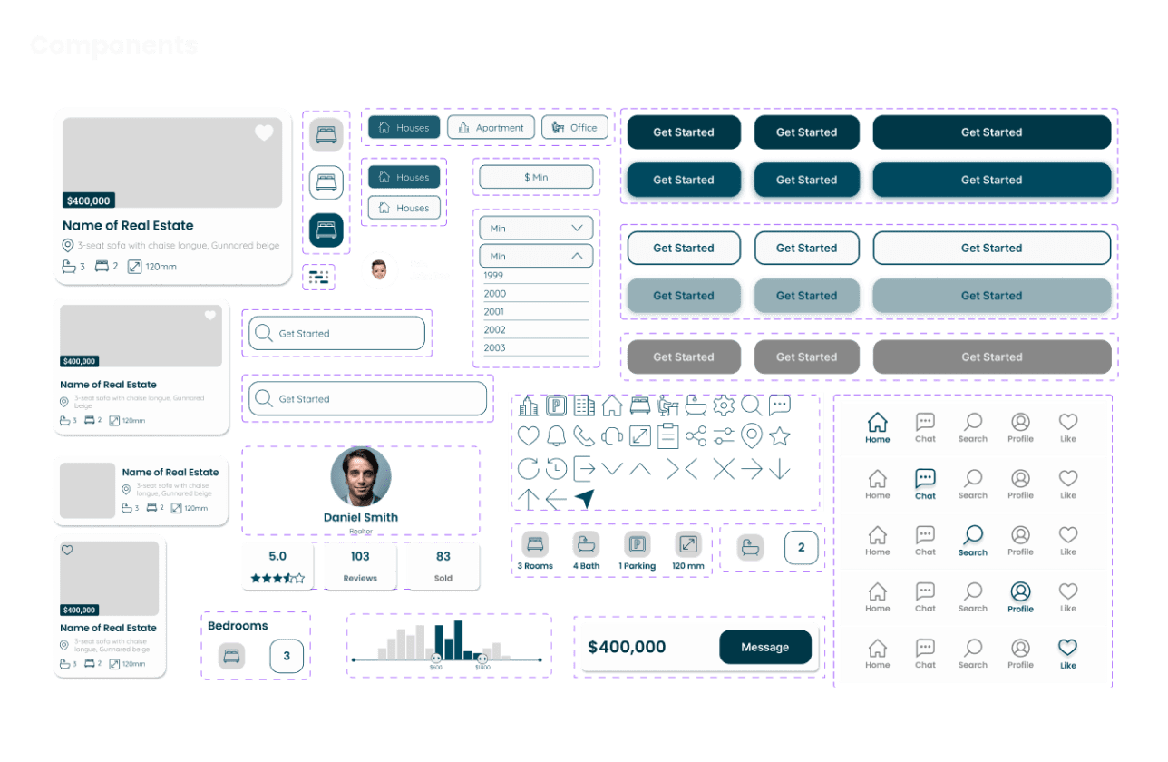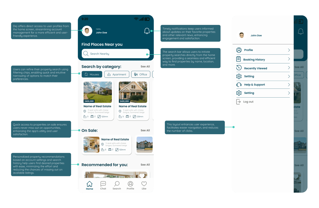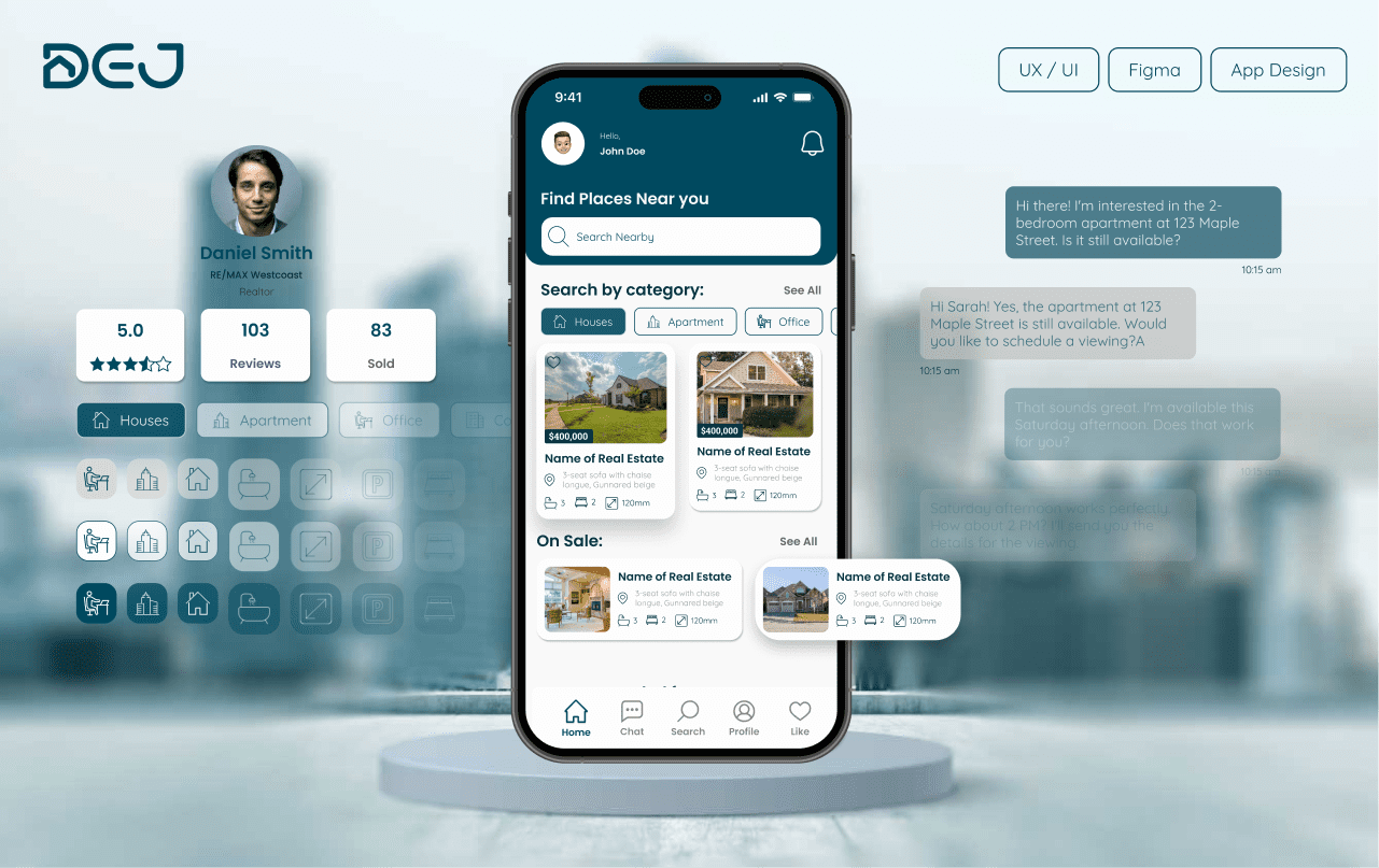 The Dej project is a real estate mobile app designed to simplify property search and property management for both renters or buyers and owners or realtors. The goal is to create a user-friendly experience where users can browse extensive listings, receive relevant recommendations, and manage their real estate needs more efficiently. This case study focuses on building a clear, intuitive, and visually engaging mobile experience for a complex market.