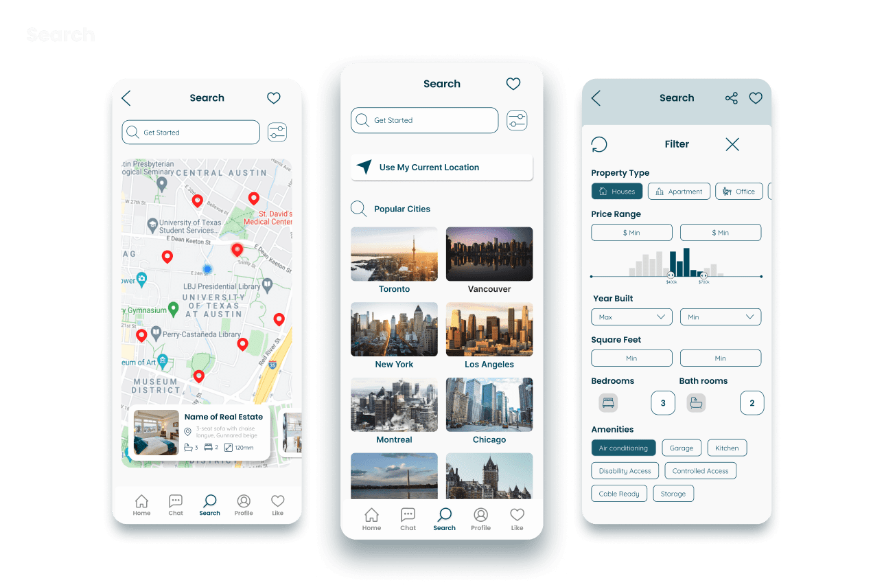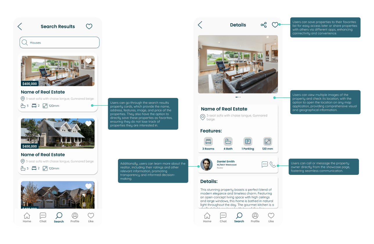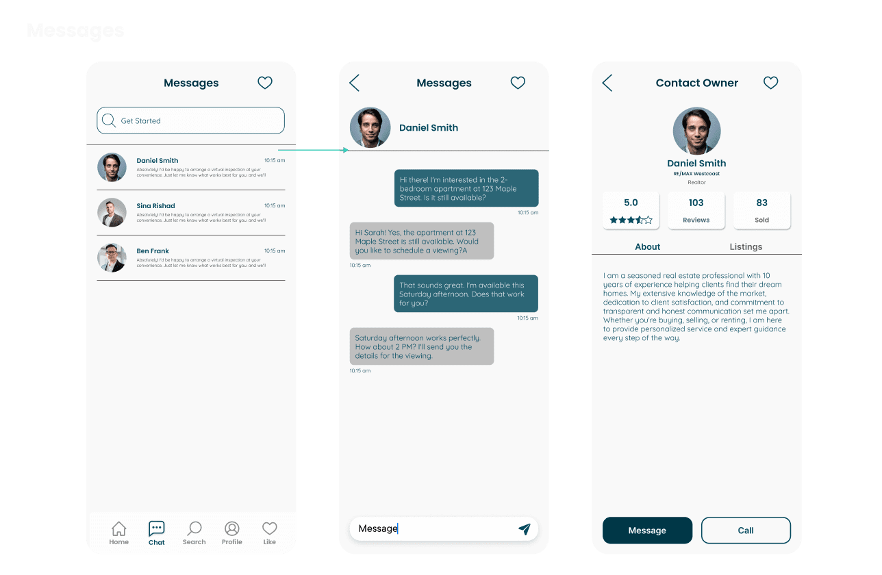 The outcome of this project was a mobile app concept designed to make the real estate journey more efficient, intuitive, and user-centered. By combining property browsing, direct communication, and essential listing details within one cohesive experience, the design helps simplify a process that is often fragmented and overwhelming. The final result reflects a balance between usability and visual clarity, creating a cleaner and more engaging platform for users searching for properties and interacting with real estate professionals.